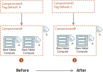 Tags are not automatically updated after a compartment move. If you have implemented a tagging strategy based on compartment, you must update the tags on the resources after the move. For example, assume CompartmentA has a child compartment, CompartmentB. CompartmentA is set up with tag defaults so that every resource in CompartmentA is tagged with TagA. Therefore CompartmentB and all its resources are tagged with default tag, TagA. When you move CompartmentB to CompartmentC, it will still have the default tags from CompartmentA. If you have set up default tags for CompartmentC, you'll need to add those to the resources in the moved compartment.