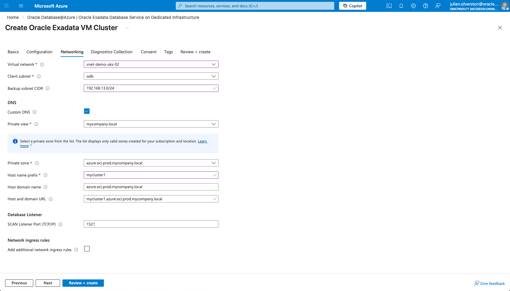 - Manual DNS Record Duplication: Because custom DNS was selected, the oraclevcn.com private zone will not be created in Azure. You must manually duplicate the DNS records for the Oracle AI Database@Azure SCAN and VIPs from OCI into your production DNS zone (