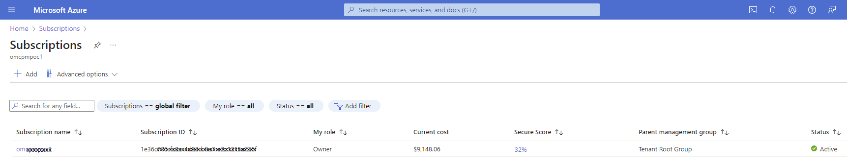 - Select Subscriptions in the search results to navigate to the Subscriptions list view. Find the subscription you want to use for onboarding in the list view.