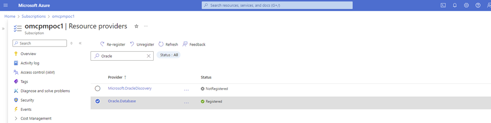 - Select the "Oracle.Database" resource in the Provider list, then select Register. Wait for the resource to display the "registered" status. This might take a few minutes.